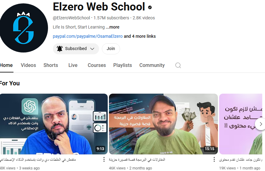قناة Elzero Web School تعد واحدة من أفضل الوجهات لتعلم البرمجة باللغة العربية، بفضل محتواها المتنوع وأسلوبها الفريد في تقديم المعلومات. يدير القناة المبرمج المحترف أسامة الزيرو، الذي يحرص على تقديم شروحات متكاملة تغطي مختلف مستويات البرمجة، من المبتدئ إلى المحترف.